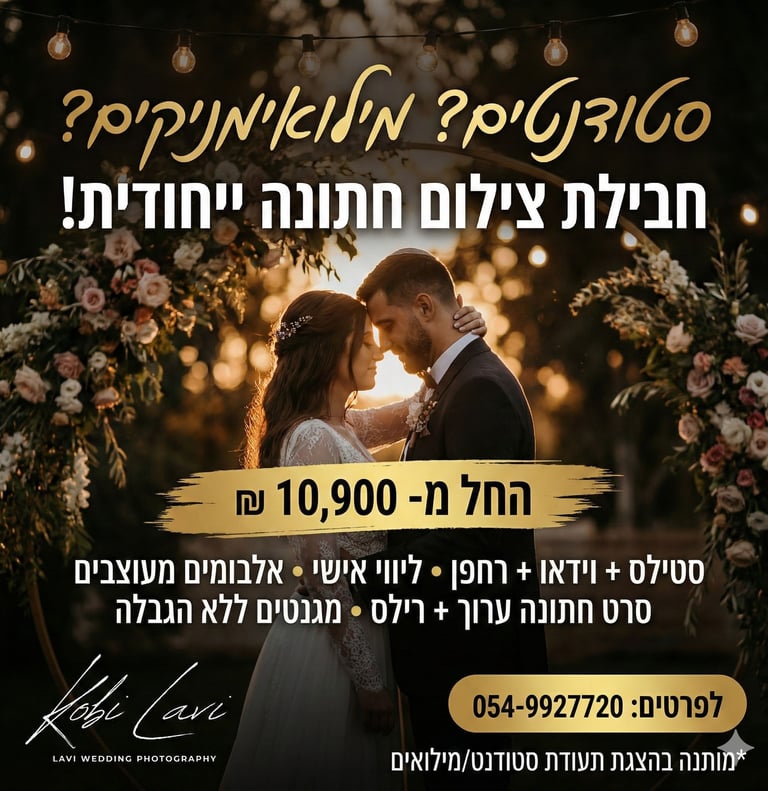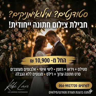 אחת מחברות הצילום המובילה בישראל עם מעל 250 חתונות בשנה. אנחנו מתמחים בלכידת הרגעים הקסומים והמרגשים של יום החתונה שלכם, ומביאים את הסיפור שלכם לחיים בעזרת תמונות מרהיבות ומעוררות השראה. העבודה שלנו מתבצעת באור טבעי, מה שמוסיף קסם ואותנטיות לכל תמונה.